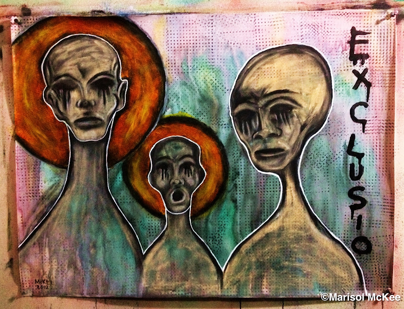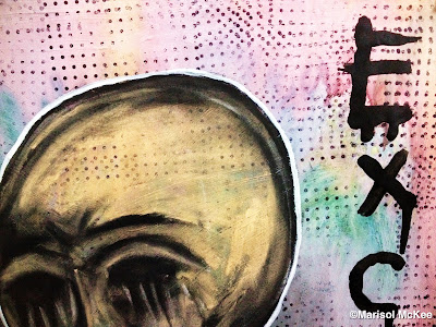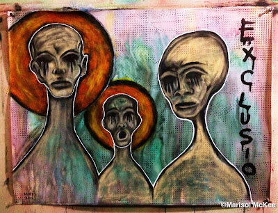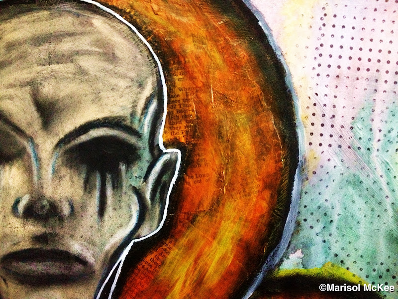 Medium: Gesso, acrylics, pencils, chalk, charcoal, pastels, india ink, and pages from tattered bible on 50 lb. acid-free paper.