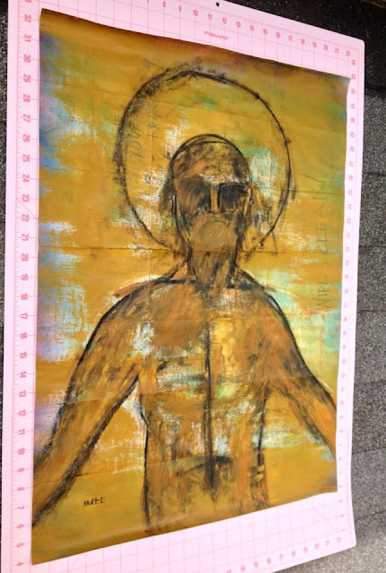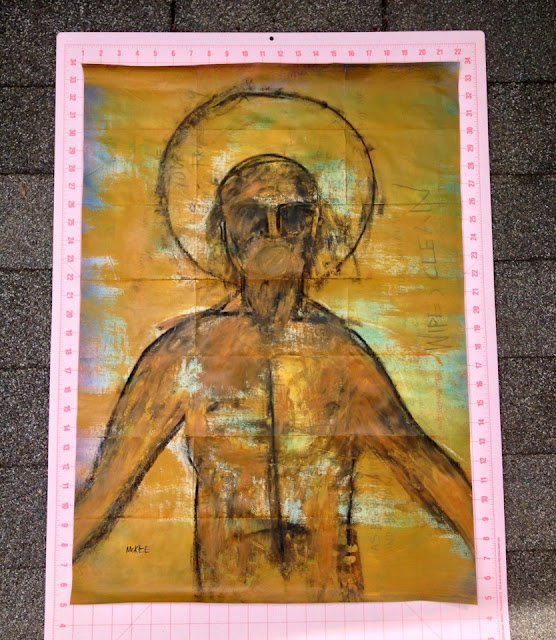 Gesso, spray paint, pencils, acrylics, and charcoal on a West Virginia road map.
