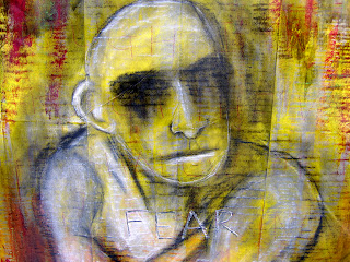 Gesso, acrylic paint, colored pencils, and charcoal on a West Virginia road map.